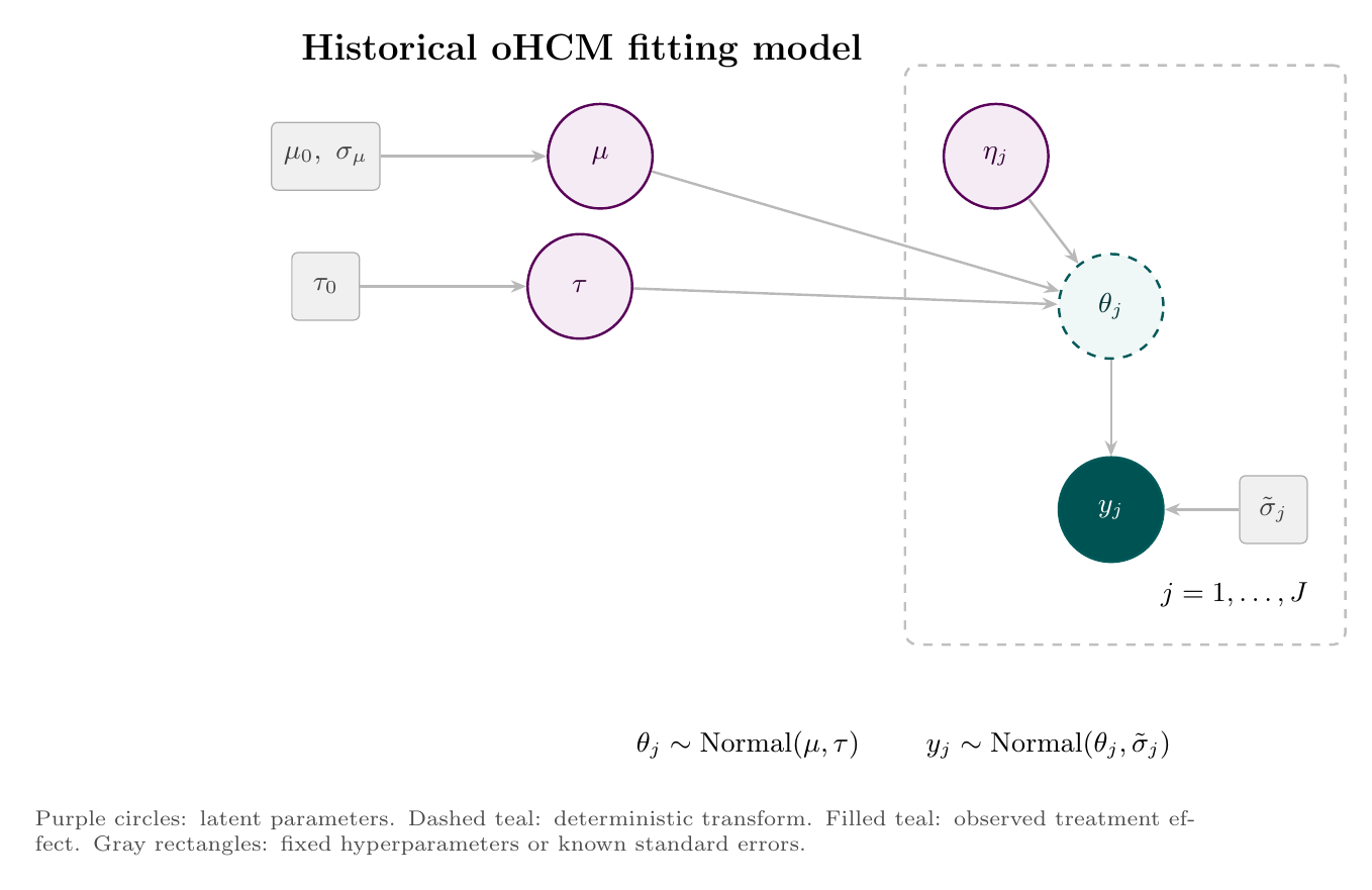 This hierarchy separates the mean myosin-inhibitor class effect, $\mu$, from between-trial heterogeneity, $\tau$. With only a few historical trials, $\tau$ should be read as a regularized uncertainty term rather than a precise empirical estimate of all possible HCM trial-to-trial variation.