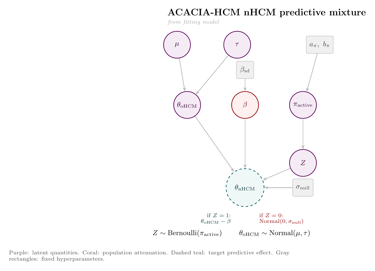 The $\mathrm{Beta}(3.5,1.5)$ prior is an empirical base-rate prior: three positive completed Phase 3 HCM myosin-inhibitor programs and one negative nHCM program, with Jeffreys smoothing. I use it as a prior on active transfer, meaning whether ACACIA belongs to the branch where the oHCM signal carries over, not as a direct measurement of biology. If $Z=1$, the oHCM predictive effect transfers but loses an attenuation amount $\beta$; if $Z=0$, the nHCM effect is drawn from a near-null distribution: