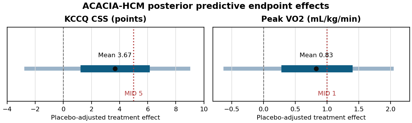 The posterior prediction translates the latent nHCM treatment-effect distribution into the two endpoint scales used for ACACIA-HCM. I report both the expected treatment effect and the predictive probability of meeting statistical and clinically meaningful thresholds.