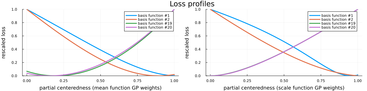 Finally, please see Figure 5 for a visualization of the loss profiles of the MCMC-method for some of the basis function weight parametrizations, Figure 6 for a visualization of the dependence of the optimized partial centeredness on the basis function number (i.e. frequency), Figure 7 for a visualization of the original posterior (as in Figure 2) sampled anew using the optimized parametrization, and Figure 8 for a visualization of the much reduced dependence of the basis function weight parameters on the GP hyperparameters.