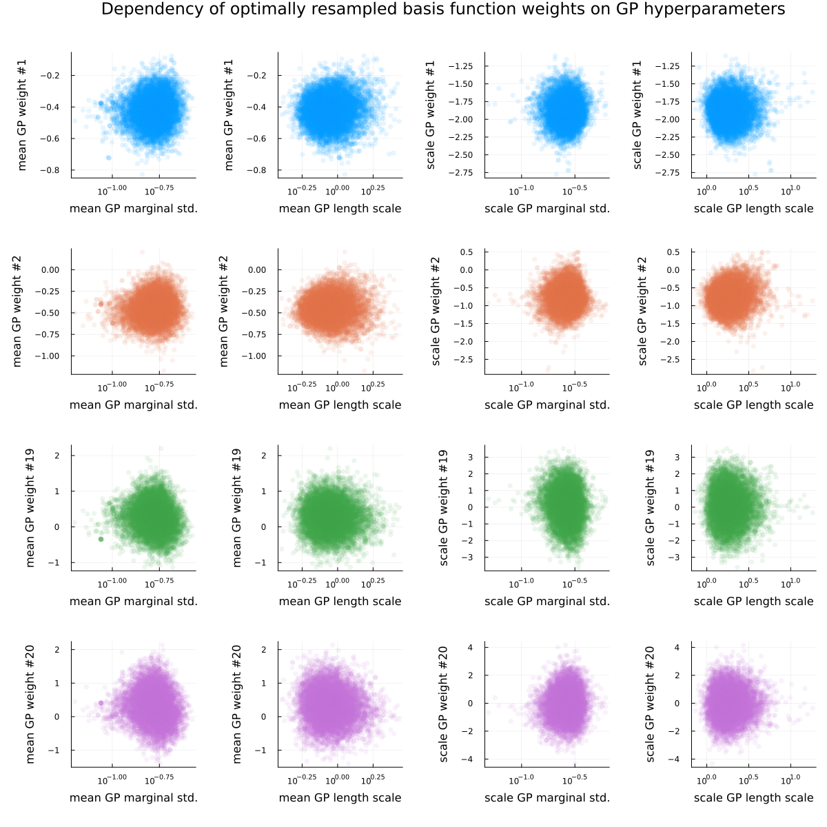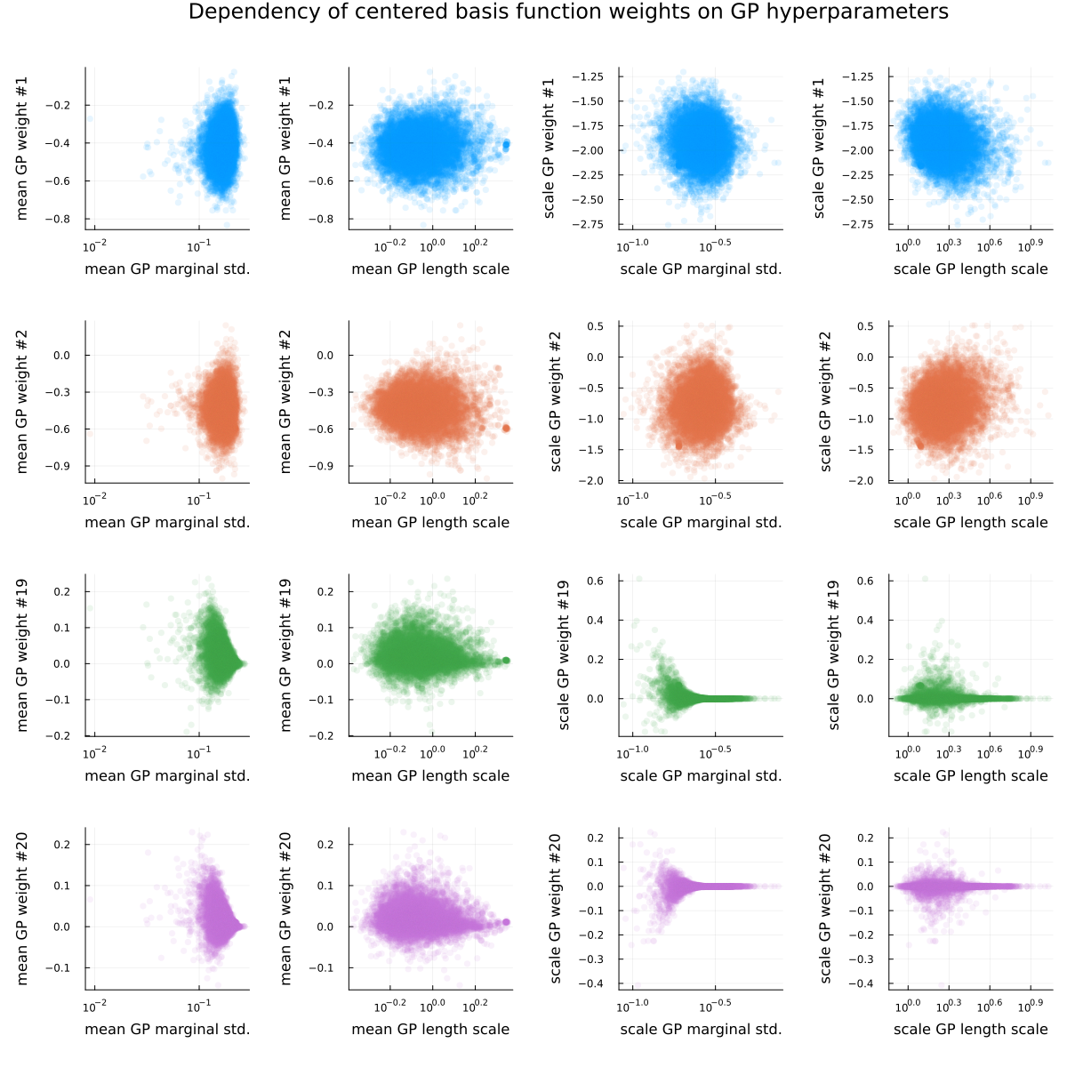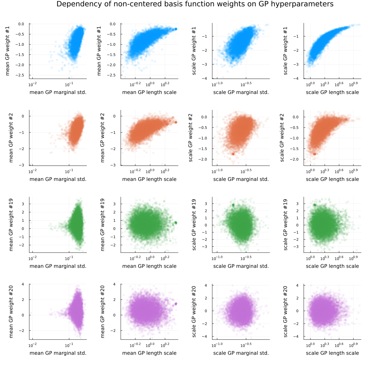 which in fact is more problematic than for the standard hierarchical model as it introduces a much stronger nonlinear dependency between the weight parameters and the hyperparameters. For the sampler, it's an (in the common worst case) double exponential dependence between $\log(\ell_\mathrm{GP})$, the natural "unconstrained"/sampler parametrization of the length scale, and the prior scale $\sigma_w(\ell_\mathrm{GP}, i)$.