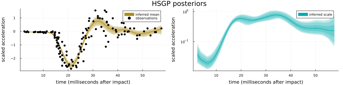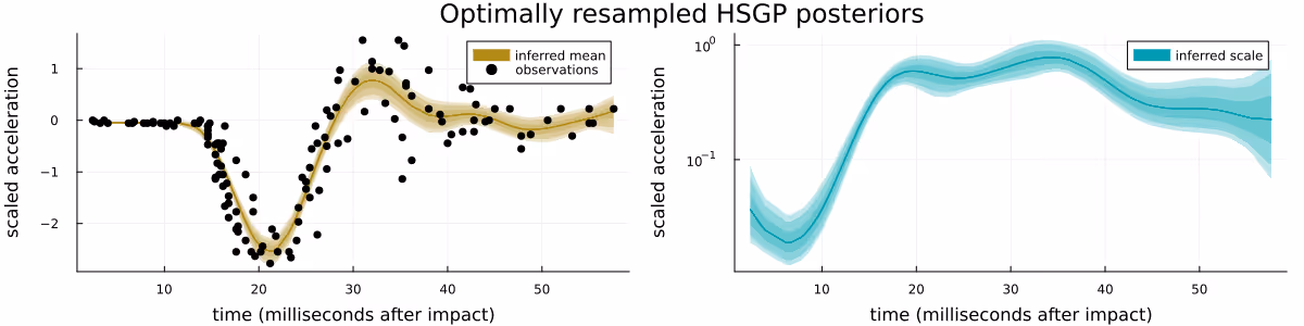 i.e. $y \sim \mathrm{normal}(\mu(x), \exp(\eta(x)))$, $\mu \sim \mathrm{GP}(0, k_\mu)$, and $\eta \sim \mathrm{GP}(0, k_\eta)$ with "appropriate" GP hyperparameter priors (see Section 6.2 for the model implementation), conditioned on the R mcycle dataset, i.e. acceleration data from a simulated motorcycle accident, see Figure 2 for a visualization of the data and the posterior. Similar difficulties are present for easier models such as the corresponding homoscedastic GP model, or more standard hierarchical models, see Section 6.5 in the appendix.