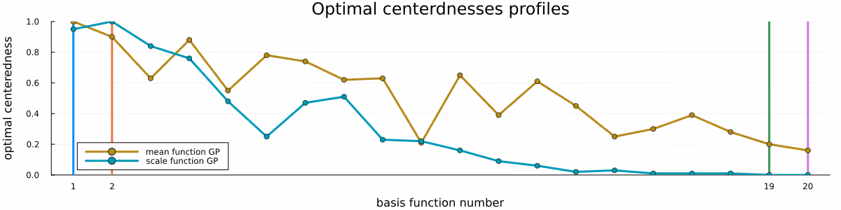 Instead, we have our GP hyperparameters, i.e. the marginal variances $\sigma^2_\mathrm{GP}$ and the length scales $\ell_\mathrm{GP}$ of the two GPs, which, as seen in Section 1 determine the priors on the basis function weights via