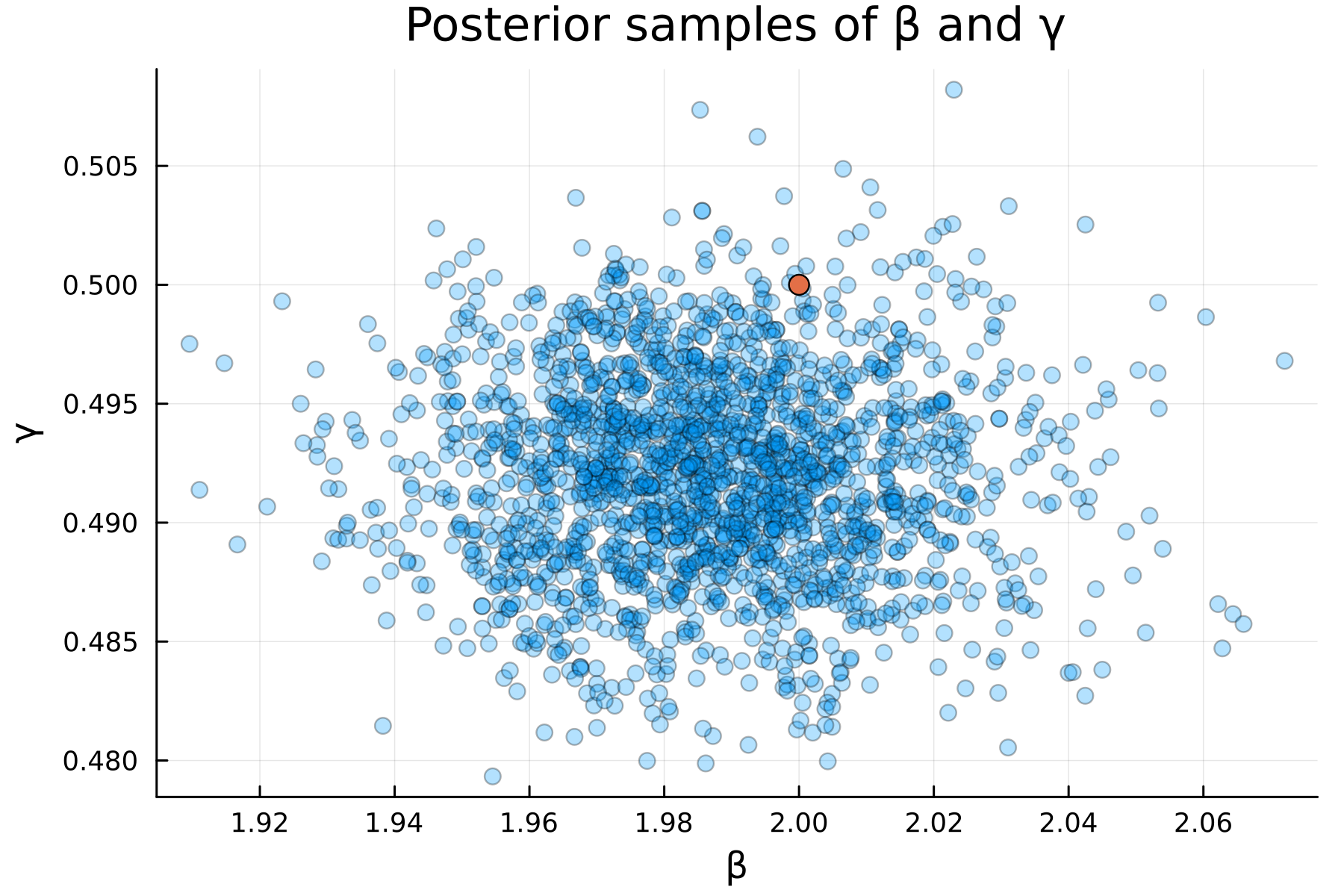title = "Posterior samples of β and γ",