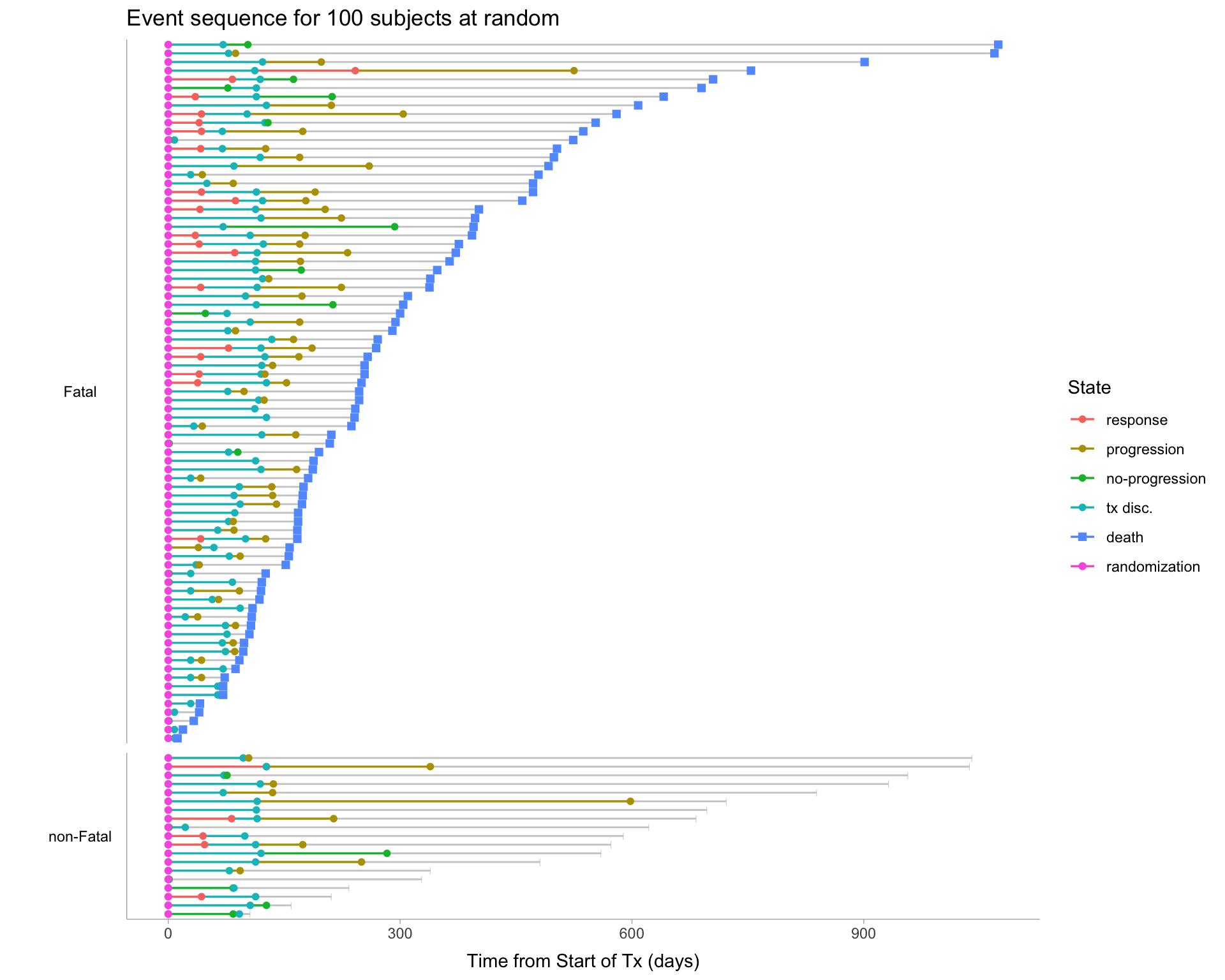 The data, as prepared, include 6 event-states, where "no-progression" refers to a subject reaching the end of tumor-size data collection without evidence of disease progression: