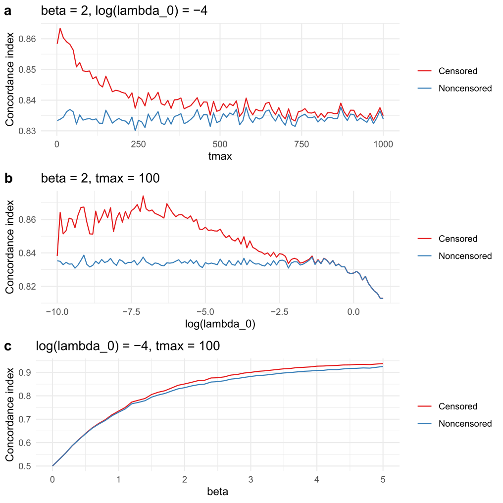 In panel a), we see that the Noncensored C-index (event times are not censored for the observed ordering) does not depend on $t_{\text{max}}$. This is as expected, because $t_{\text{max}}$ does not change the ordering of the survival probability. The Censored version is higher with small $t_{\text{max}}$, and it approaches the Noncensored version as $t_{\text{max}}$ grows. This makes sense because when we increase $t_{\text{max}}$, less and less subjects get censored. The C-index looks only at comparable pairs of subjects. The reason why the Noncensored version is higher with small $t_{\text{max}}$ could be that the subjects pairs that are left to be compared are easier to rank.